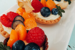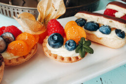 Die süße Leichtigkeit des Lebens. Unsere frisch angerührten Desserts sind in kleinen Gläschen und unsere gebackenen Minikuchenstücke werden auf schönen Platten und Etageren dekorativ angerichtet. Frisches, mundgerecht aufgeschnittenes Obst erfreut alle Nascher.