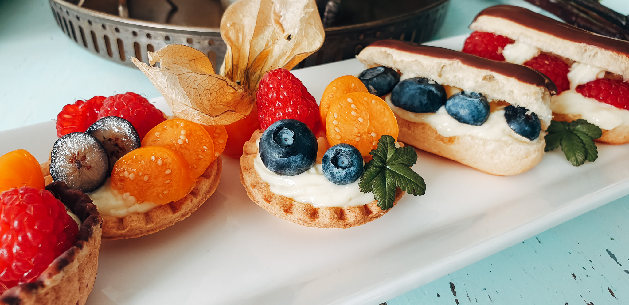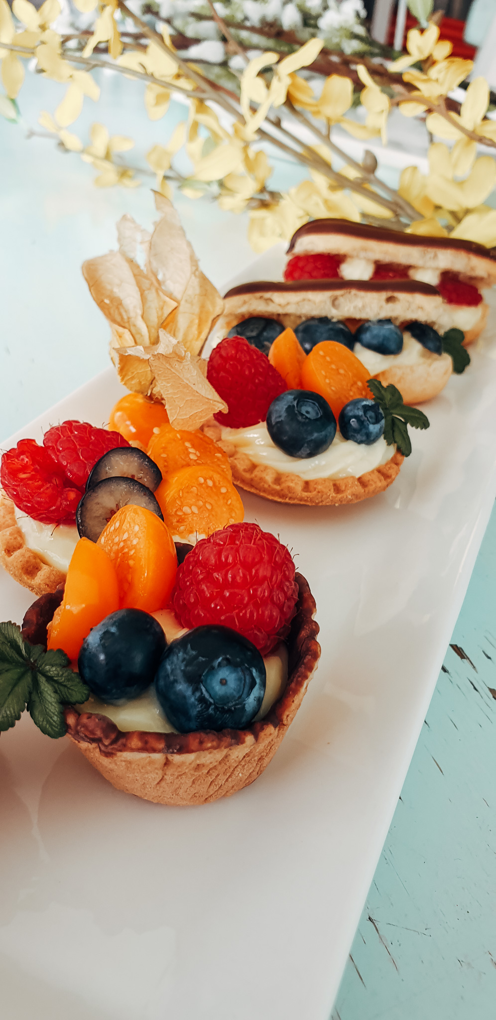 Die süße Leichtigkeit des Lebens. Unsere frisch angerührten Desserts sind in kleinen Gläschen und unsere gebackenen Minikuchenstücke werden auf schönen Platten und Etageren dekorativ angerichtet. Frisches, mundgerecht aufgeschnittenes Obst erfreut alle Nascher.