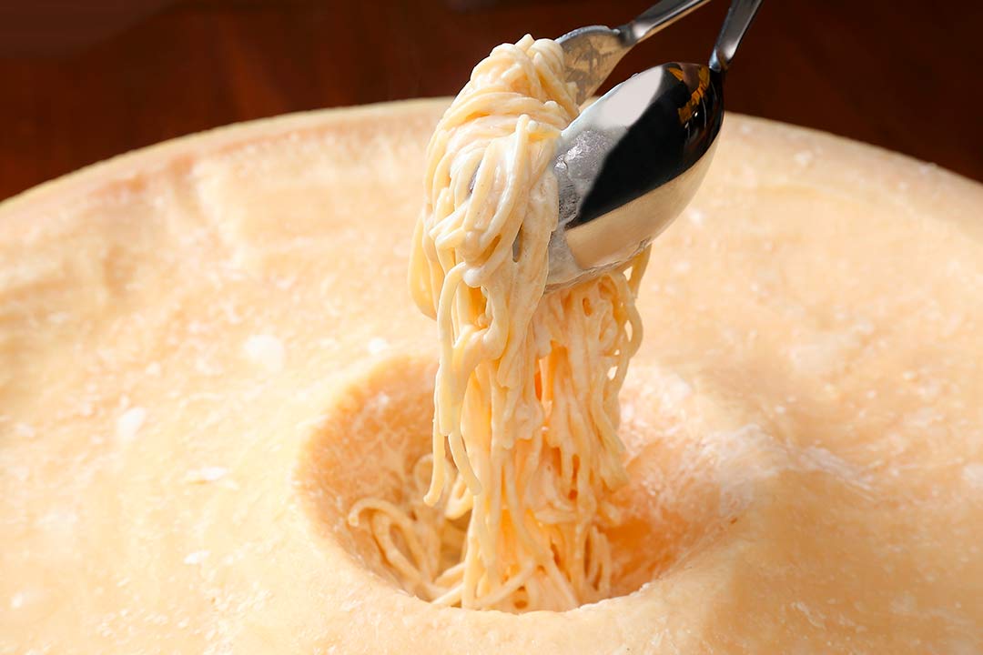 Unser Highlight – Pasta aus dem Parmesanlaib, vor Ihren Gästen zelebriert.Menu serviert