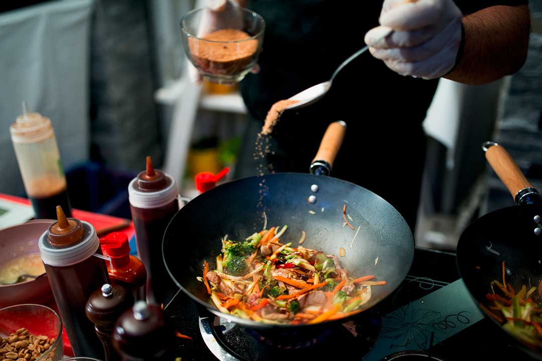 Tolles Showkochen, Fleisch tranchieren und frisches Wok-Gemüse a la Minute am Buffet zubereitet, das bietet einen besonderen Event für Ihre Gäste.
