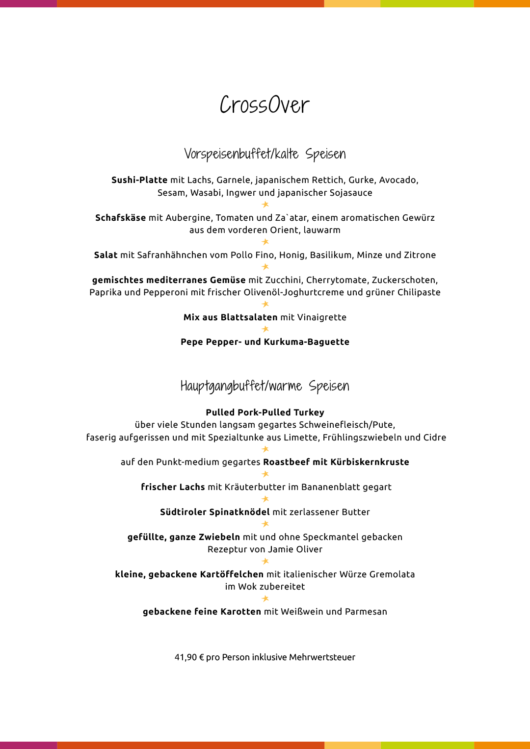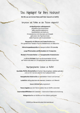 Die Speisen bekommen ihr Finish frisch am Buffet direkt vor Ihren Gästen! Unsere Chefköchin für mediterran-deutsche Küche – Floria Piazza – empfiehlt unser Menu aus Überzeugung.