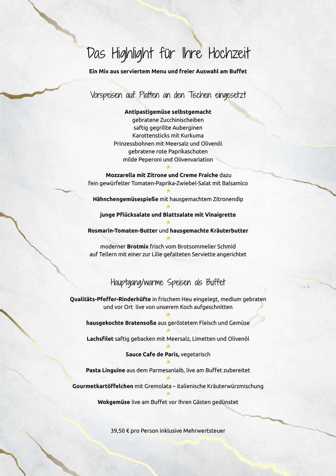Das Besorgen der Mehrweg-Kisten, Kühlen, Einlagern und Entsorgen sämtlicher Getränke und des Leerguts übernehmen wir gerne. Sie sollen sich am Hochzeitstag entspannt zurücklehnen. Wir verfügen über ein eigenes Getränkelager, sodass stets ausreichend Getränke vorhanden sind. Am Tag nach der Hochzeit nehmen wir Ihnen die Arbeit des Aufräumens und Entsorgen der leeren Kisten und Flaschen ab.Bekommen Sie Appetit beim Lesen unserer Menüs
