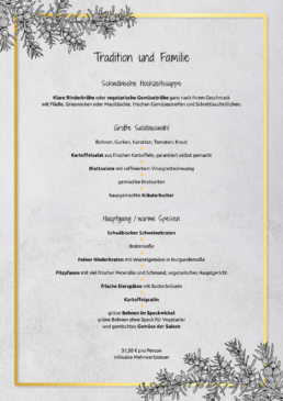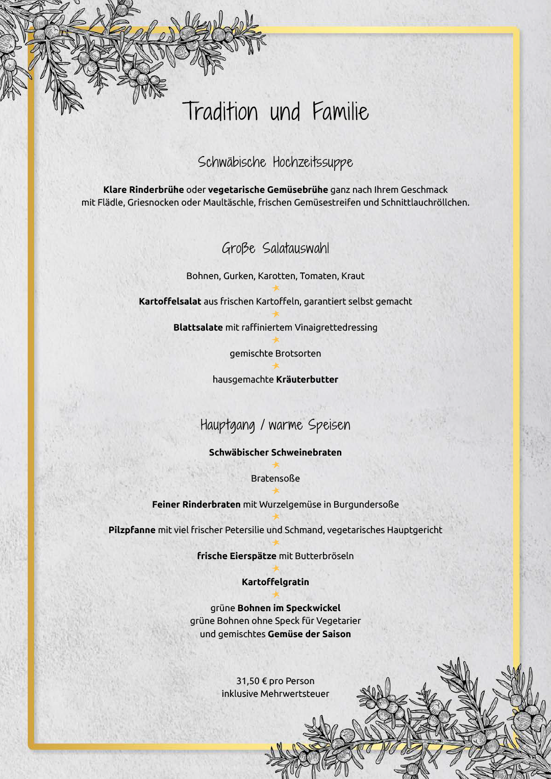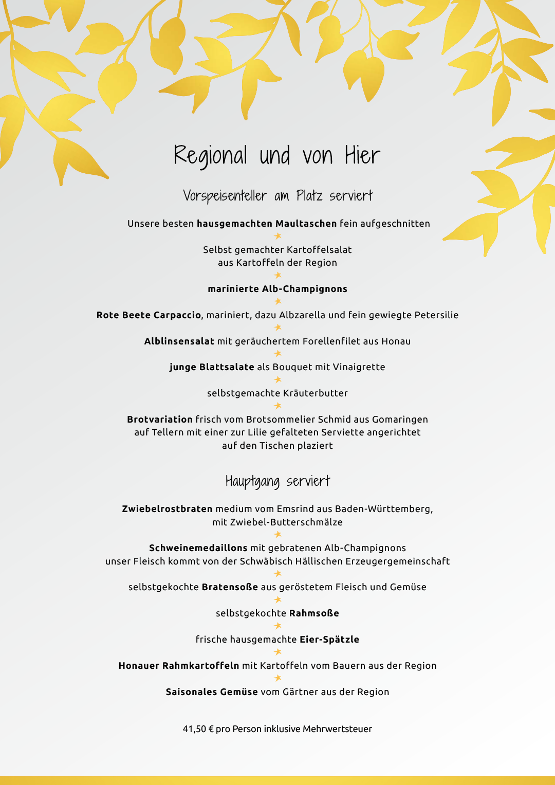 Für alle Brautpaare die Tradition mögen oder Ihren Gästen aus deutschen Bundes-Ländern oder der großen, weiten Welt die hiesigen Spezialitäten präsentieren wollen. Ehrliche Küche mit Qualität!