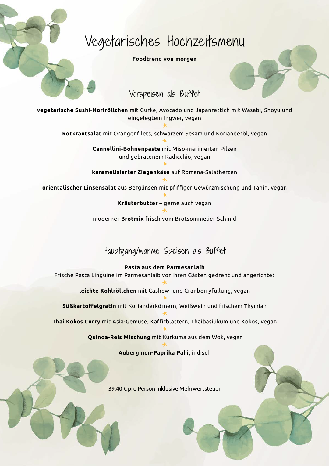 Ein eigener Vegan-Vegetarischer Hochzeitskatalog kommt auf Wunsch gerne zu Ihnen per Mail.